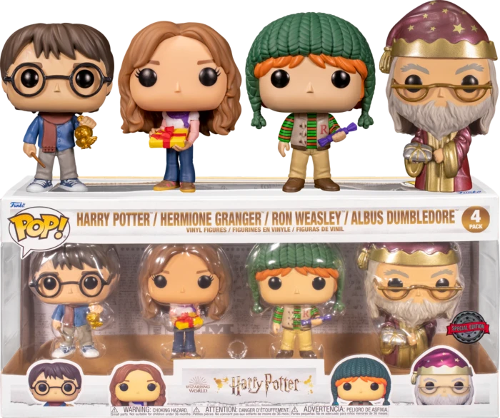 This Pop! 4-Pack features five of our favourites including Harry with his golden Hedwig, Hermione Granger and Dumbledore with their gifts, as well as Ron Weasley with his bon-bon. Oh and to top it off, Dumbledore boasts a Metallic finish!