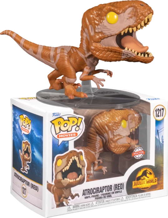 This Pop! features Red, one of the new breeds of raptor in the film known as Atrociraptors.