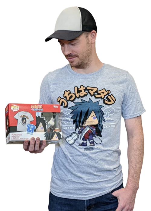 Featured in this Pop! & Tee Box is Madara Uchiha, the legendary leader of the Uchiha clan, as he appears once he is reanimated by Sage Kabuto, with the cells of the 1st Hokage. As a result, Madara possesses immortal body and unlimited chakra and has the ability of Six Paths to use the Rinnegan. He comes armed with his Scythe and War Fan.